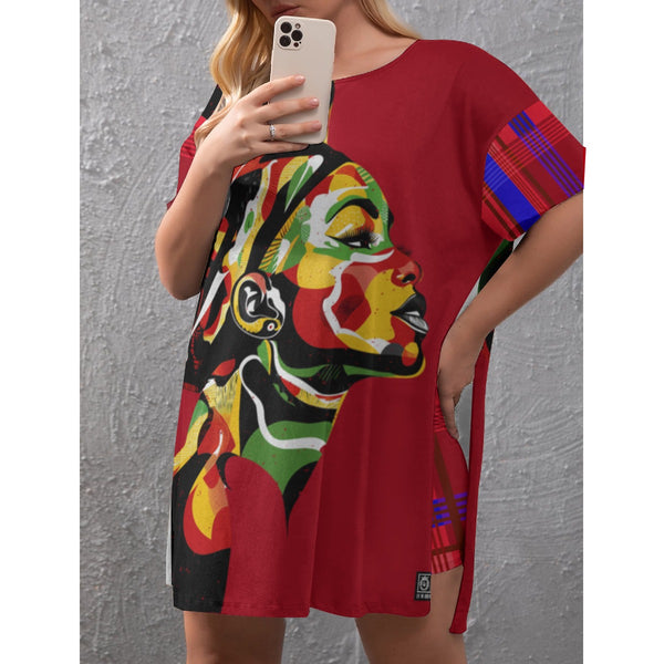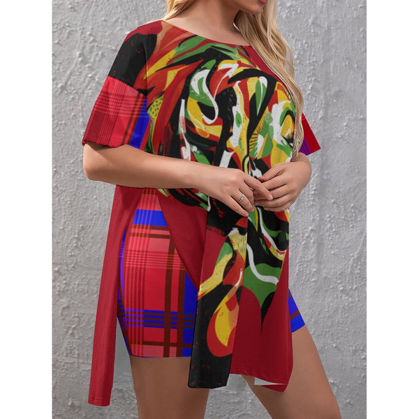 MADRAS RED CHWITY Women's Drop-Shoulder T-Shirt with Side Split and Shorts (Plus Size)
