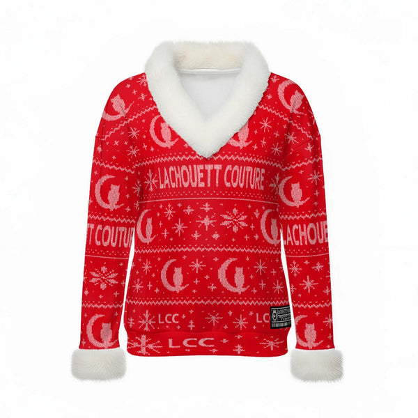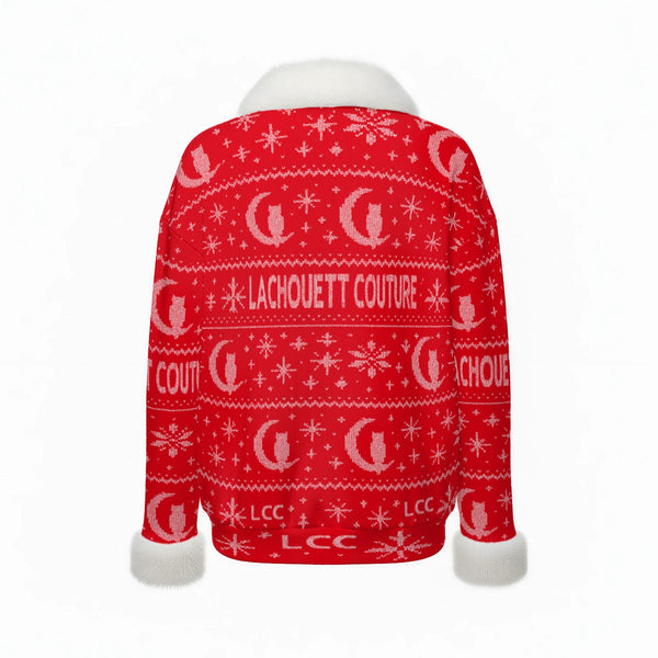 Crafted from soft polyester fabric, this faux knit sweater top features delicate faux fur trim along the neckline and cuffs for a touch of cozy elegance. The relaxed silhouette offers effortless comfort while maintaining a refined, chic look — perfect for pairing with jeans, skirts, or leather shorts.